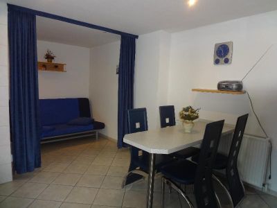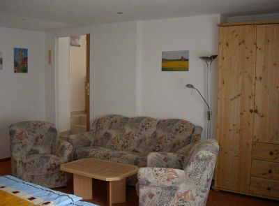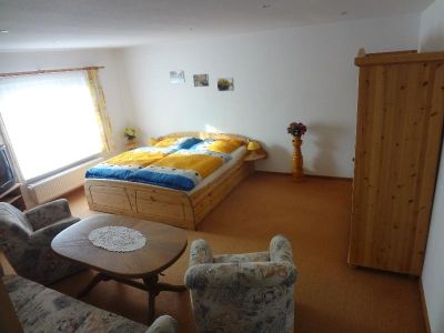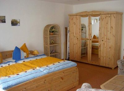 Im Anschluss an die Küche liegt ein sehr geräumiges Schlafzimmer mit massiv Kiefermöbeln, Doppelbett und Kleiderschrank. Eine Sitzgarnitur als Wohnecke, Fernseher mit Sat. TV laden zum Faulenzen und Entspannen ein. Von diesem Raum aus kommen Sie auch in einen kleinen Garten, in dem Sie rauchen können, denn unser Ferienhaus hätten wir gern im Interesse der Allgemeinheit rauchfrei.