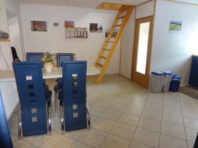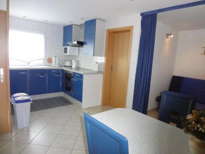 Zu ebener Erde liegt die geräumige Einbauküche. Mit moderner Sitzgruppe lädt sie zum gemütlichen, gemeinsamen Essen ein. Die Küche ist mit allem Komfort ausgestattet: Cerankochfeld, Backofen mit Heißluft, Dunstabzugshaube, Kaffeemaschine mit Thermokanne, Toaster, Mikrowelle, Kühlschrank mit Gefrierfach sowie komplettes Geschirr, Besteck und diverses Zubehör. Zur Unterhaltung stehen Ihnen Stereo-Radio, CD-Player zur Verfügung.