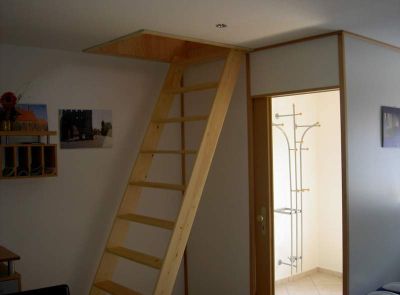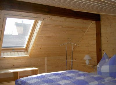 Wieder zurück zur Küche: Über eine Art "Hühnerleiter"  (für Kleinkinder nicht geeignet) kommen weitere Gäste in ein modernes weiteres Schlafzimmer unter den Dach, komplett mit Kiefernholz ausgekleidet und ebenfalls mit einem großen Doppelbett sowie einem Fernseher eingerichtet.